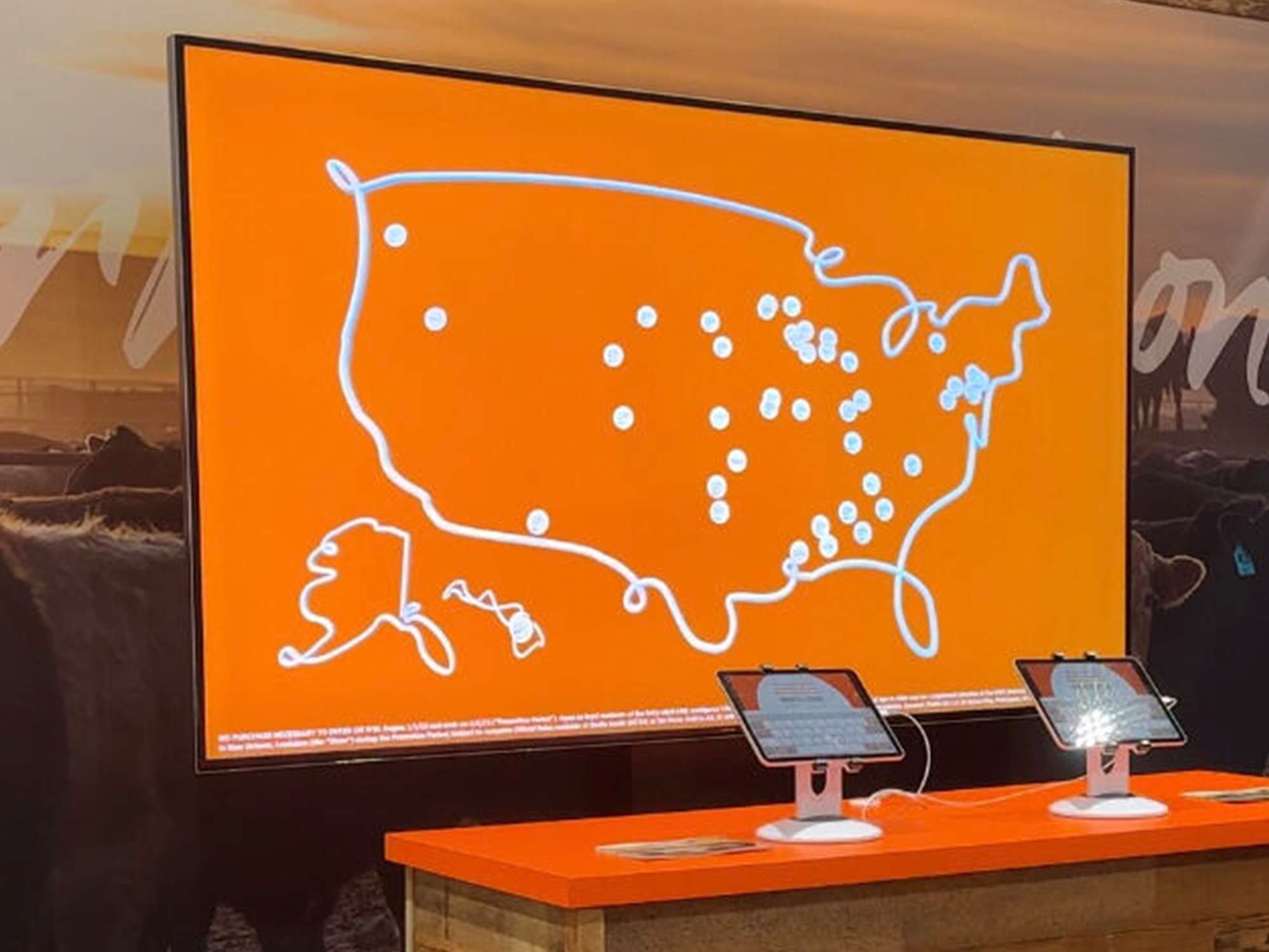 We’ve harnessed big screens, cool graphics and iPad tablets to customize this experience to your brand. People can put their names, locations, as well as customized messaging and photos onto the big screen. The map is animated to zoom onto different pins delivering personalized engagement. We can include customized promotional gear giveaways like hats or shirts for participating.